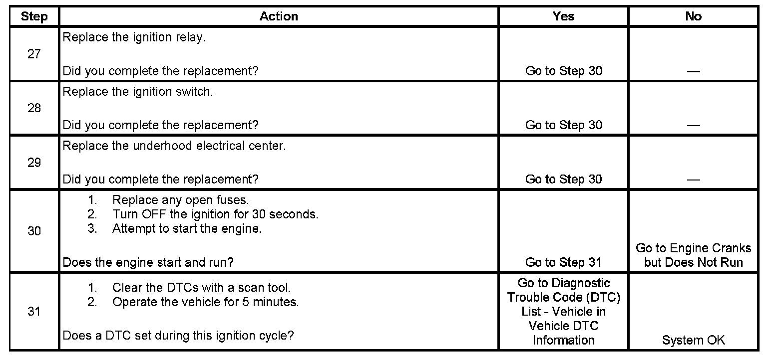 If the ignition relay fails to close, the engine will crank, but will not run. The class 2 communications will be available with the use of a scan tool.
