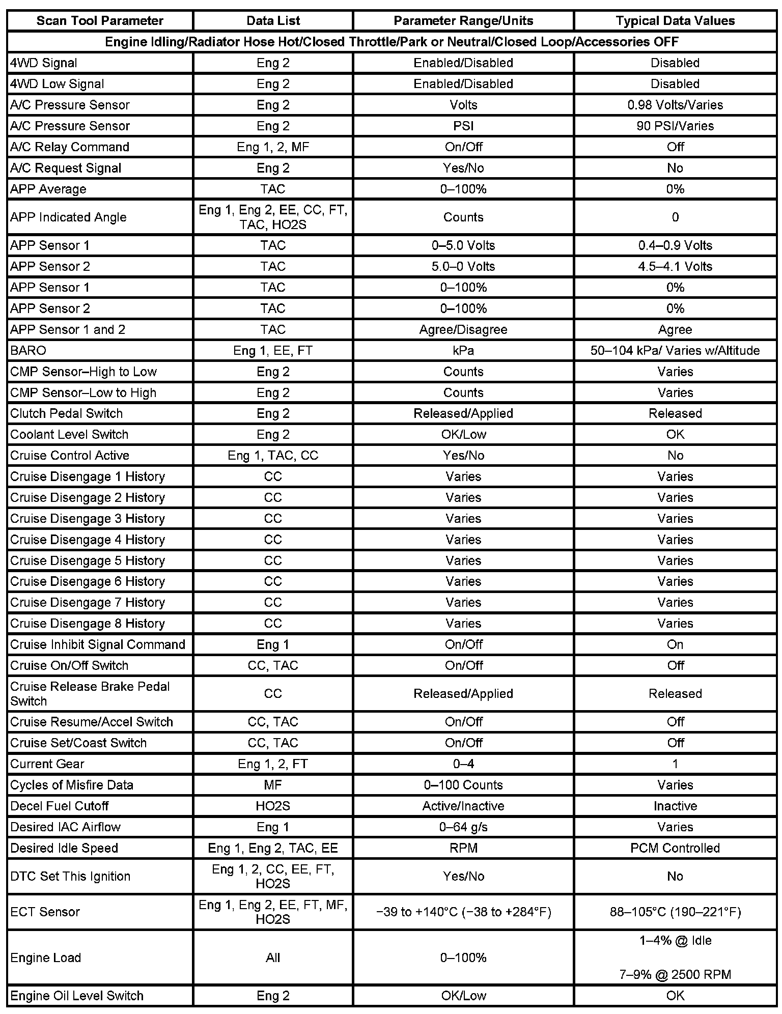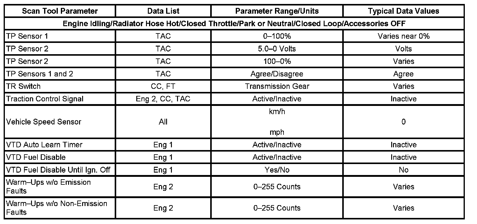 Only the parameters listed below are referenced in this service data for use in diagnosis. If all values are within the typical range described below, refer to Symptoms - Computers and Control Systems for diagnosis. Symptom Related Diagnostic Procedures
