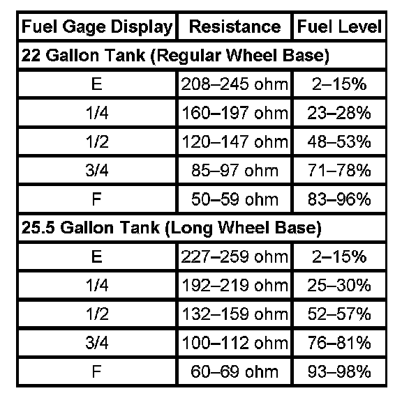The information in this table is intended for use with the J 33431-C Signal Generator and Instrument Panel Tester. The fuel level sensor values represent the test values to be used on the Signal Generator to drive the fuel gage display to the indicated positions. Vehicles that require more than one fuel level sensor calculate gage position from many possible resistance combinations of fuel levels between the two tanks. Therefore, the values in the table may not correlate directly to readings taken from the vehicle primary or secondary sending units.