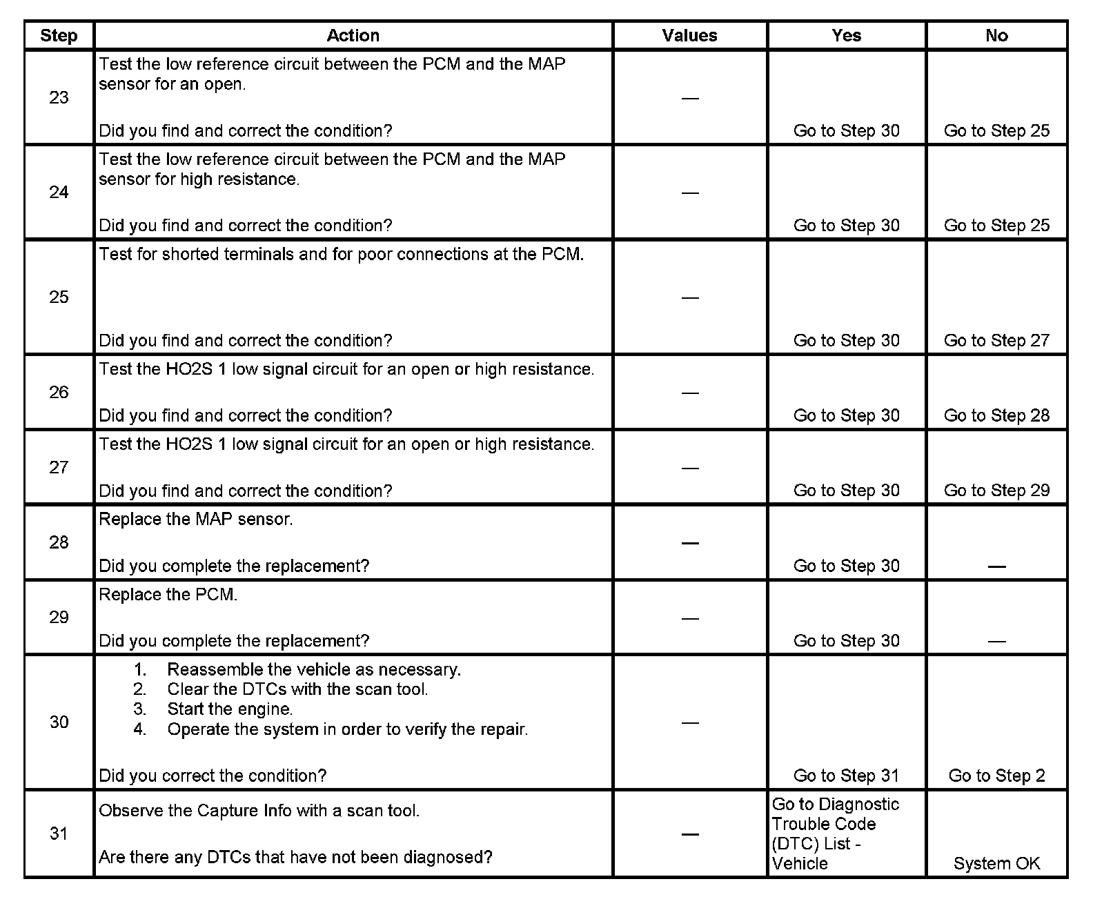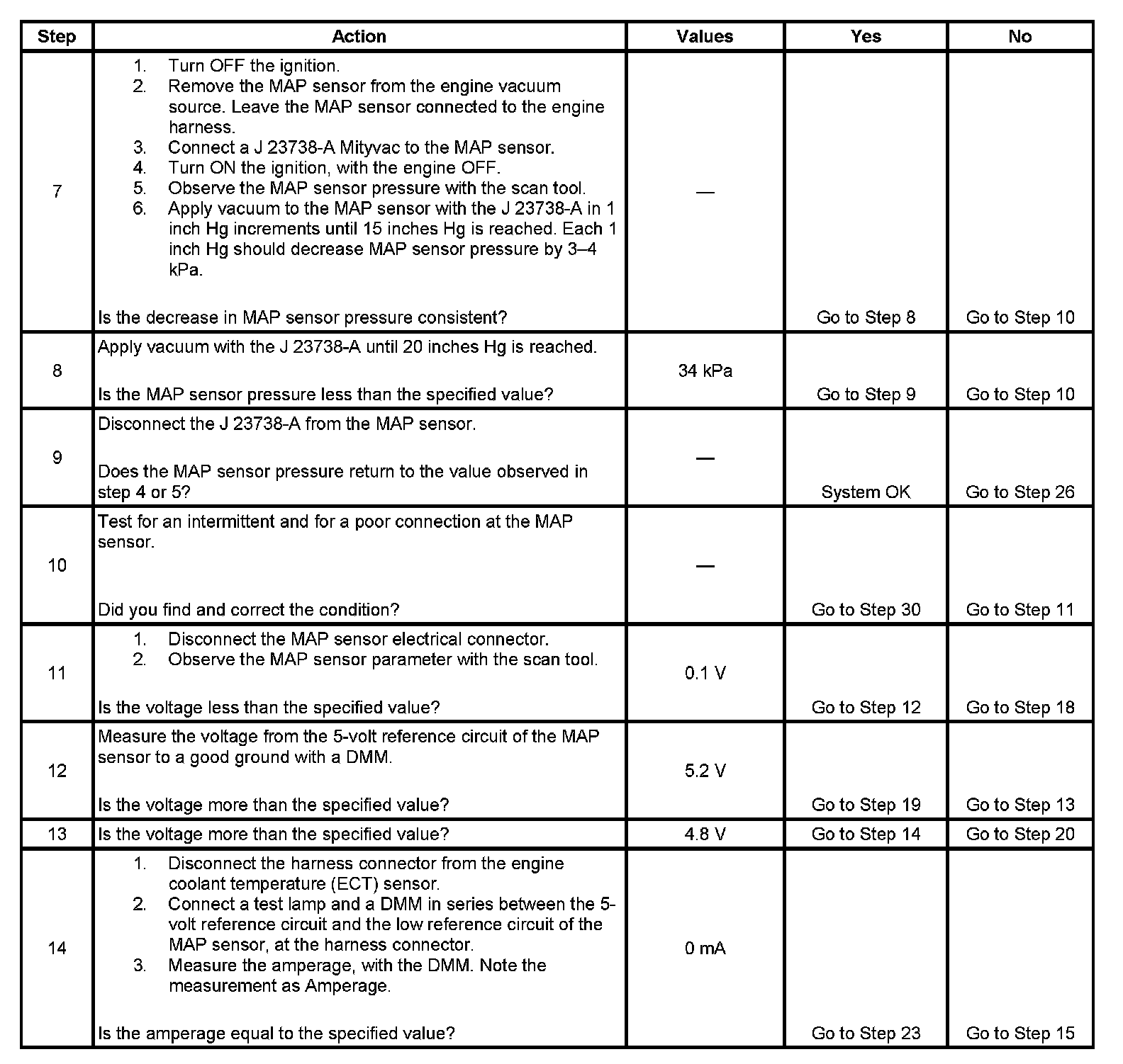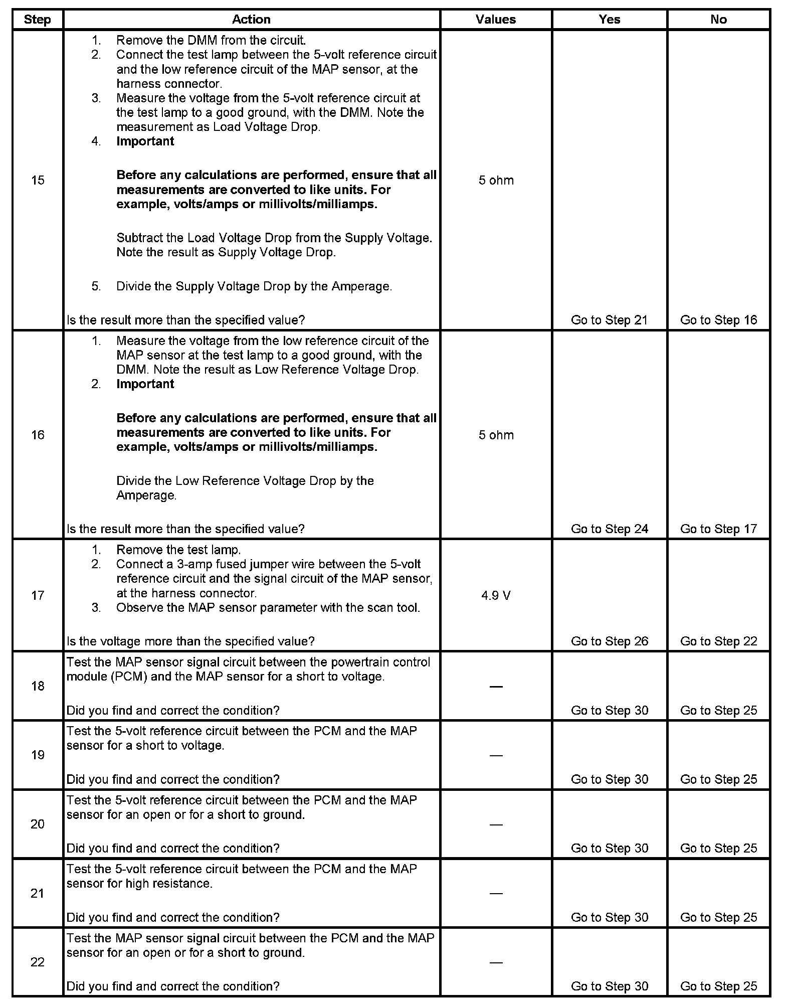 The manifold absolute pressure (MAP) sensor responds to changes in intake manifold pressure which gives an indication of the engine load. The MAP sensor has a 5-volt reference circuit, a low reference circuit, and a signal circuit. The powertrain control module (PCM) supplies 5 volts to the MAP sensor on the 5-volt reference circuit and provides a ground on the low reference circuit. The MAP sensor provides a signal to the PCM on the MAP sensor signal circuit, which is relative to the pressure changes in the manifold. With low MAP, such as during idle or deceleration, the PCM should detect a low MAP sensor signal voltage. With high MAP, such as ignition ON, engine OFF, or wide open throttle (WOT), the PCM should detect a high MAP sensor signal voltage. The MAP sensor is also used in order to calculate the barometric pressure (BARO) when the ignition switch is turned ON, with the engine OFF. The BARO reading may also be updated whenever the engine is operated at WOT. The PCM monitors the MAP sensor signal for voltage outside of the normal range. If the PCM detects a MAP sensor signal voltage that is excessively low, DTC P0107 sets. If the PCM detects a MAP sensor signal voltage that is excessively high, DTC P0108 sets.