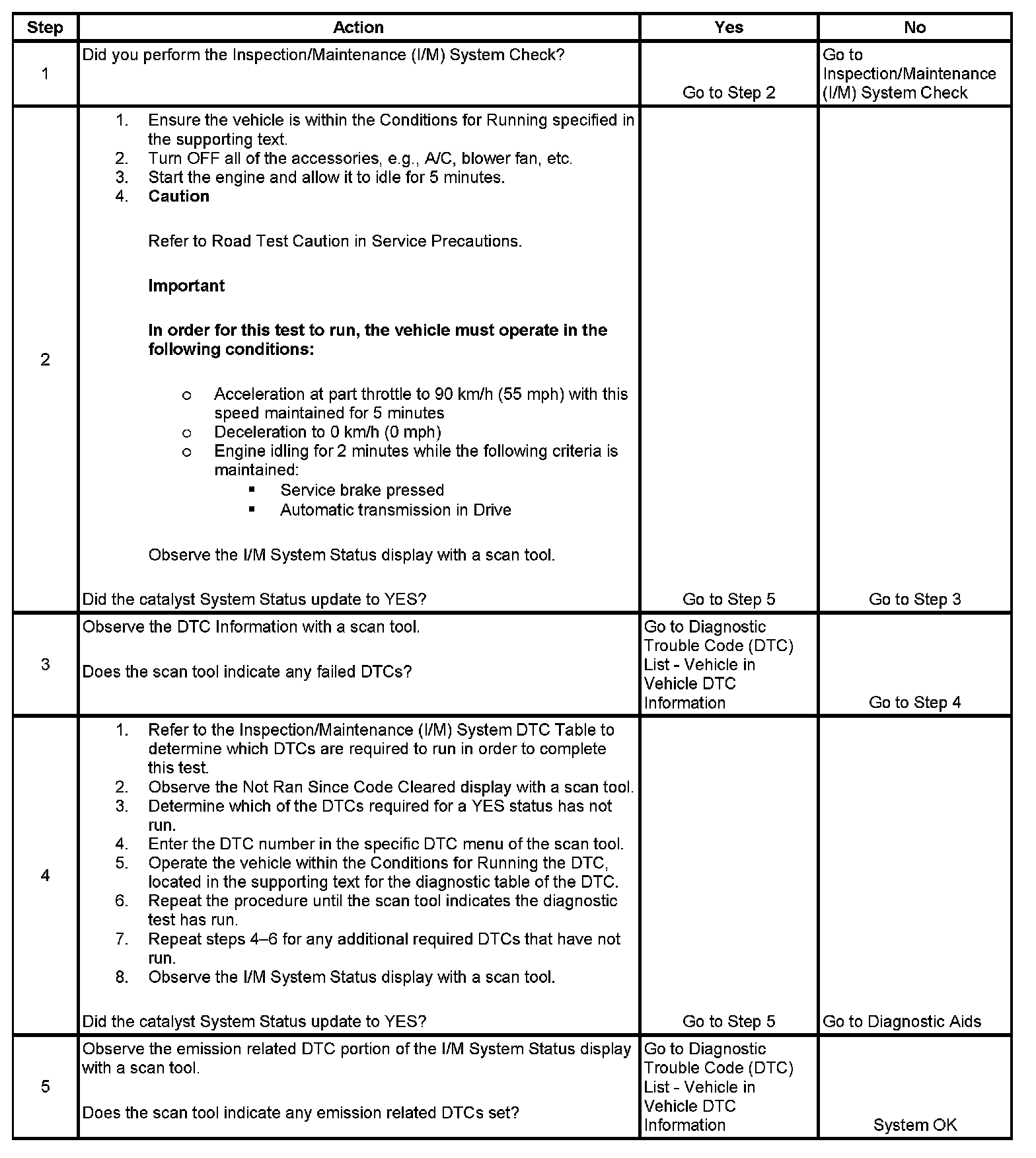 The purpose of this test is to satisfy the enable criteria necessary to execute inspection/maintenance (I/M) readiness diagnostics for the catalyst system. The test may be used to set the I/M System Status indicators to YES. The I/M System Status display on the scan tool provides an indication of whether the control module has completed the required tests. The I/M System Status does not indicate that the tests have passed or failed. When all of the diagnostics for a specific system have run and passed, the I/M System Status will update to YES. If a test for a specific system has failed, the I/M System Status will update to YES, indicating a determination was made even if all of the other tests for that system have not run.