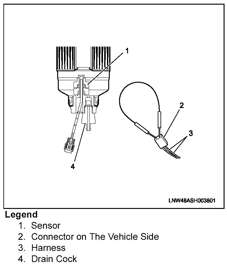 1. Check that there is continuity between the switch connector terminals when the float in the fuel sedimenter is above the water drain line.