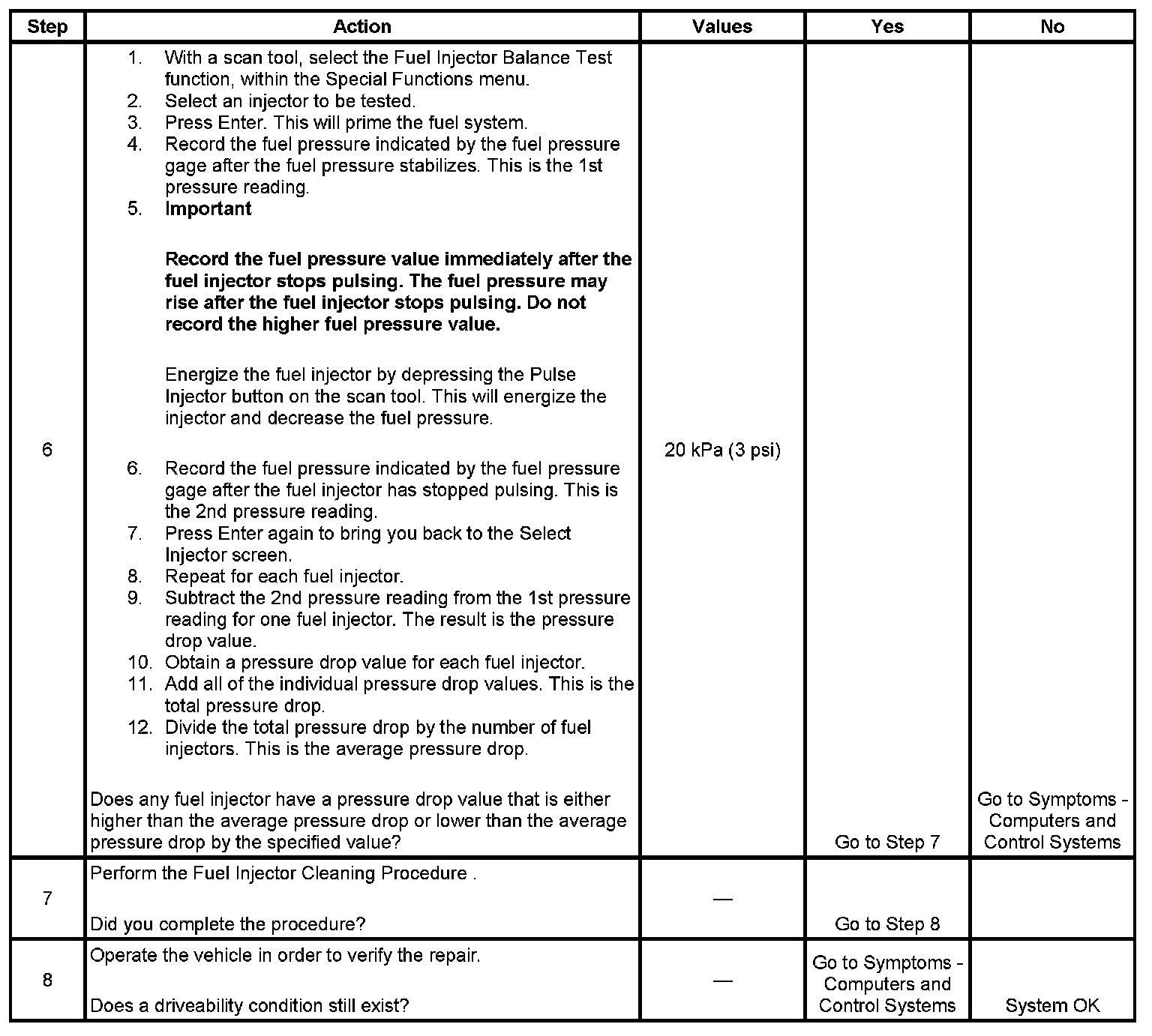 6. If the pressure drop value for each fuel injector is within 10 kPa (1.5 psi) of the average pressure drop value, the fuel injectors are flowing properly. Calculate the pressure drop value for each fuel injector by subtracting the second pressure reading from the first pressure reading.
