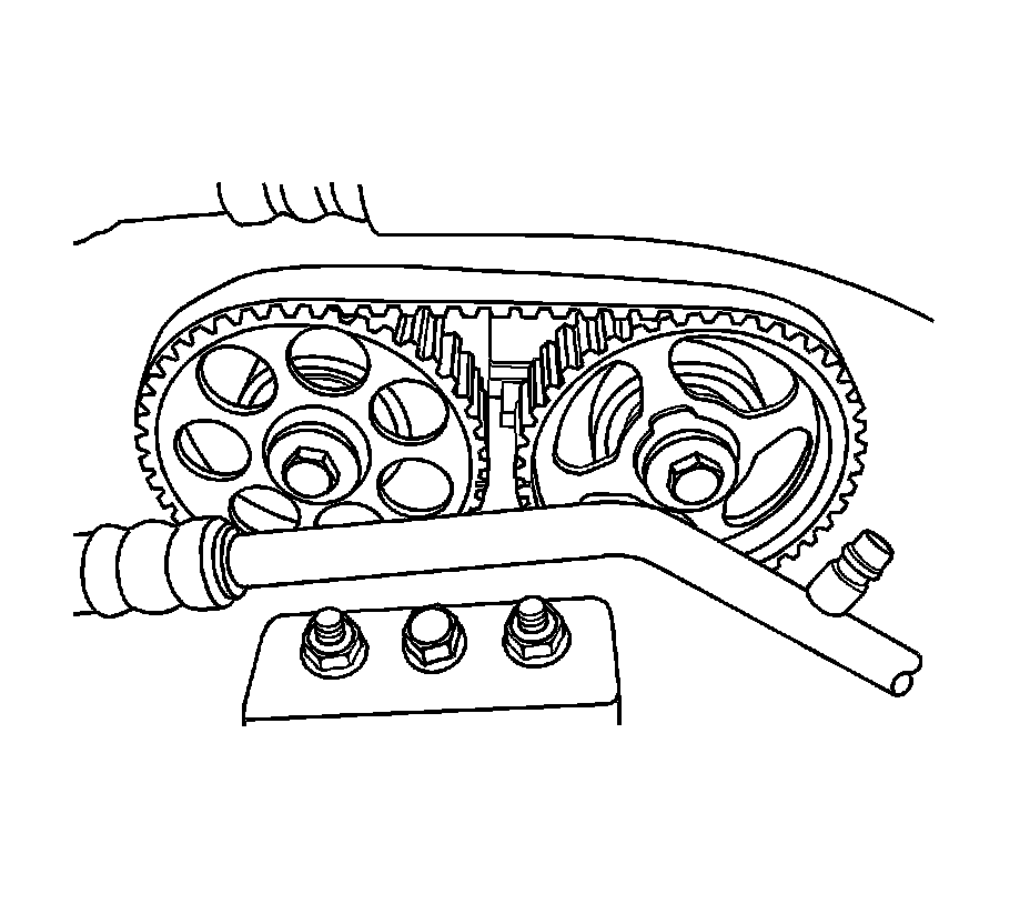27. Use the J 42492-A, rotate the coolant pump until the adjust arm pointer of the timing belt automatic tensioner is aligned with the pointer on the timing belt automatic tensioner bracket.