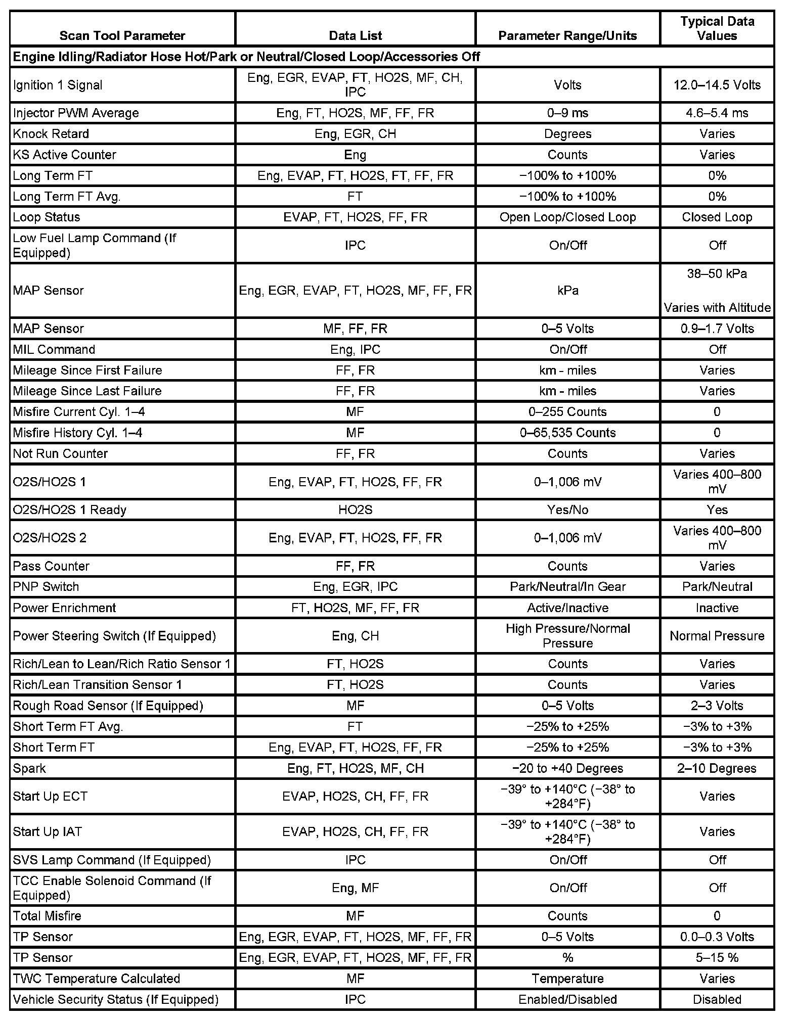 The Engine Scan Tool Data List contains all engine related parameters that are available on the scan tool. The list is arranged in alphabetical order. A parameter may appear in any one of the data lists, and in some cases may appear more than once, or in more than one data list in order to group certain related parameters together.