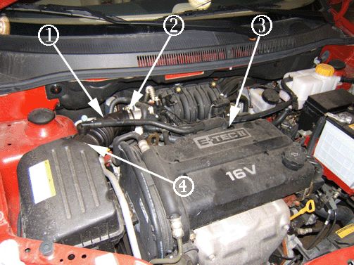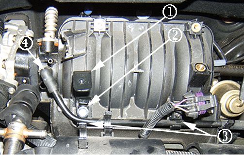 19. Remove the EVAP hose (3) from the intake manifold vacuum port (1) and from both retainers at the bottom of the intake manifold (2, 4).