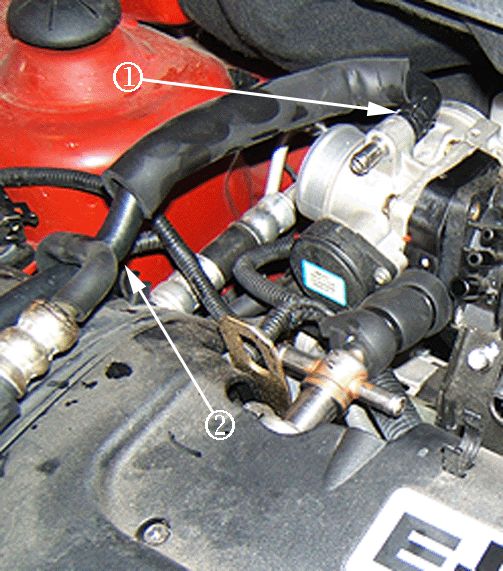 2. Disconnect the coolant hoses from the throttle body assembly (2).
