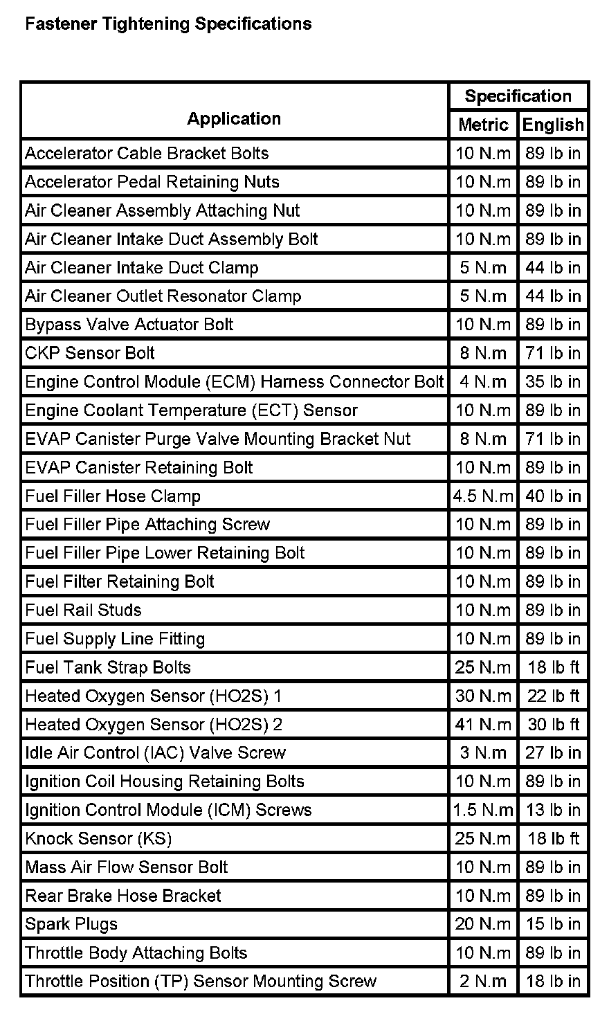 Fastener Tightening Specifications: