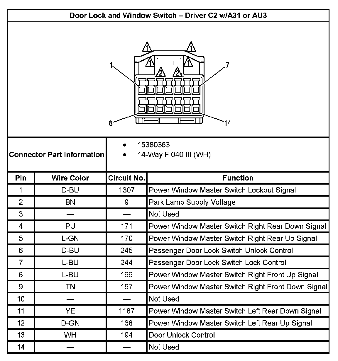 Door Lock and Window Switch - Driver C2 With RPO Code A31 Or AU3: