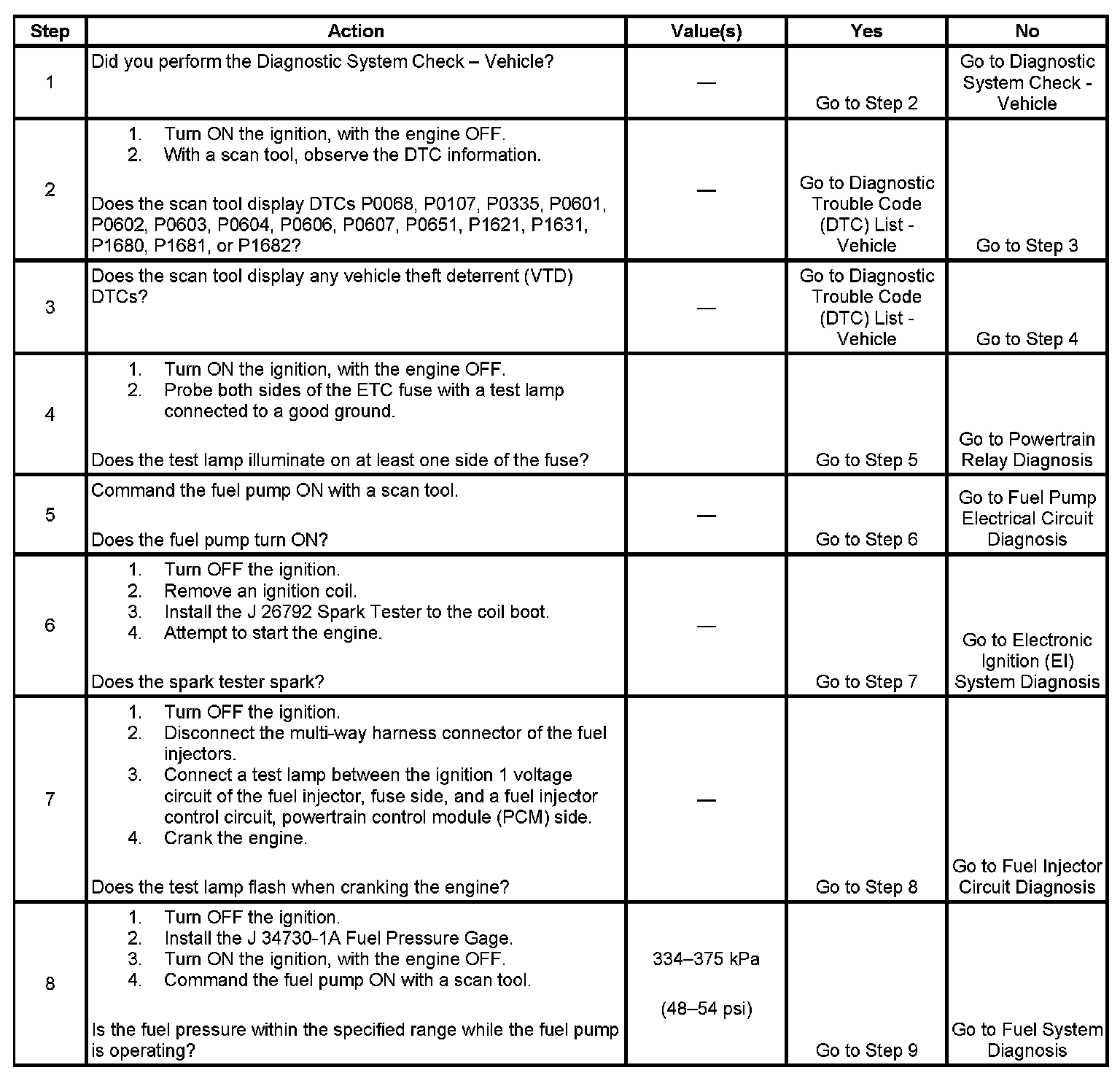 The Engine Cranks but Does Not Run diagnostic table is an organized approach to identifying a condition that causes an engine not to start. The Engine Cranks but Does Not Run diagnostic table directs the service technician to the appropriate system diagnosis.