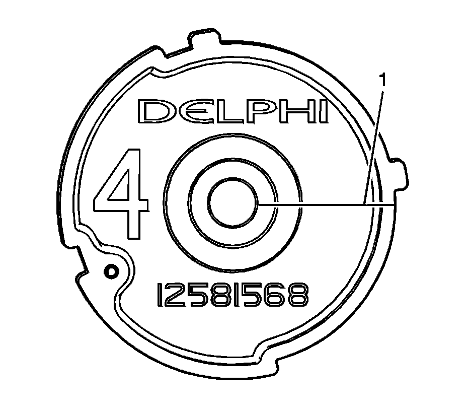 2. Scribe or draw a line (1) on the camshaft position actuator outer ring face, in the full advanced position. With the engine at TDC on #1 cylinder, the wording should be level.