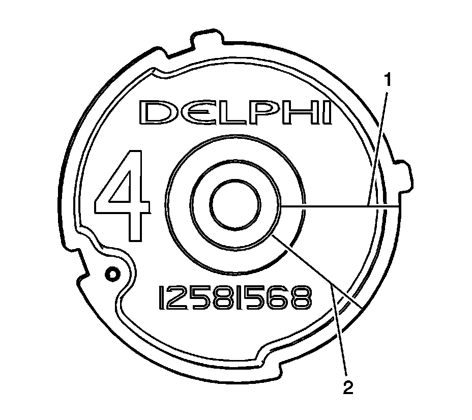 5. Scribe or draw a line (2) on the camshaft position actuator at that position.
