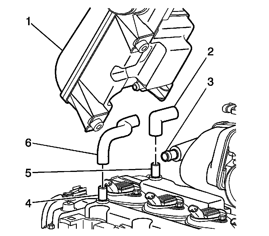 ^ Test for vacuum at the positive crankcase ventilation (PCV) dirty air hose (2) where it connects to the vacuum orifice tube (5) in the camshaft cover. There should be manifold vacuum present at the hose (2). If there is no vacuum, inspect for a plugged hose, leaking hose or a plugged intake manifold passage.