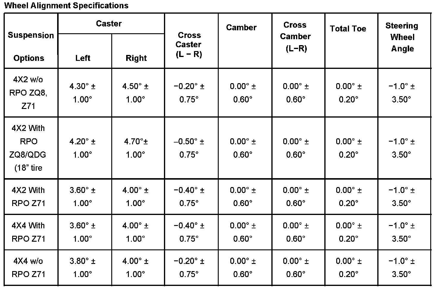 This bulletin is being issued to revise the Wheel Alignment Specifications in the Wheel Alignment sub-section of the Service Manual. Please replace the current information in the Service Manual with the following information.