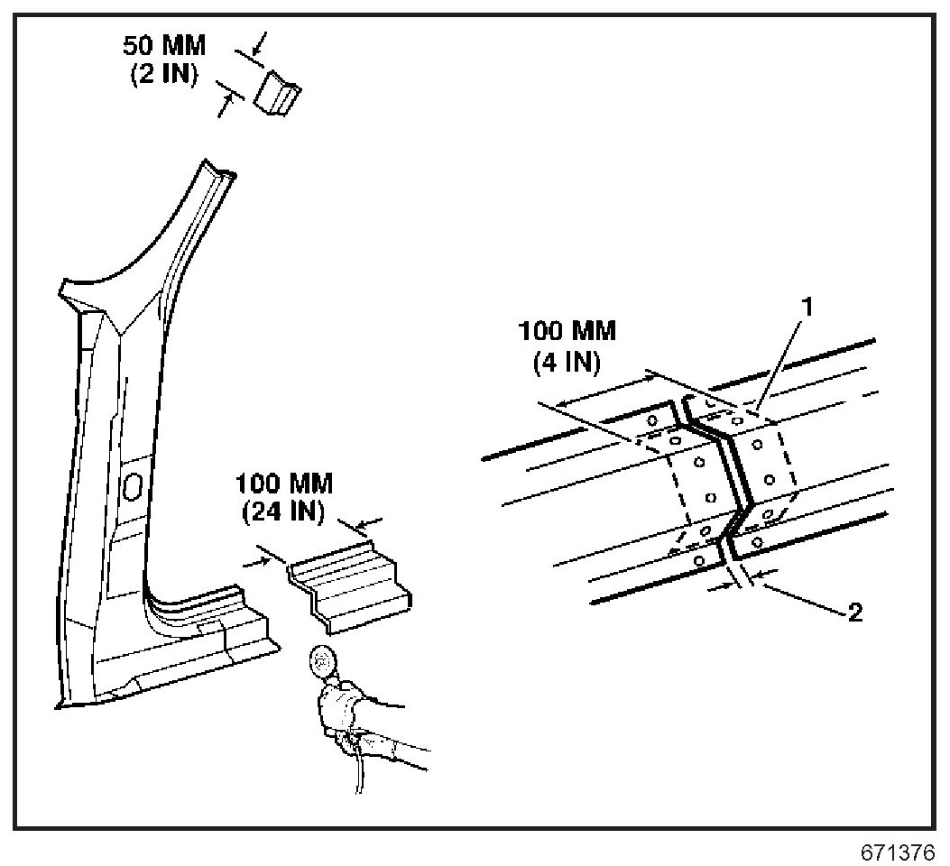 1. Cut the replacement windshield pillar section in corresponding locations to fit the original panel. The sectioning joint should be trimmed to allow 1 1/2 times the metal thickness at the sectioning joint.