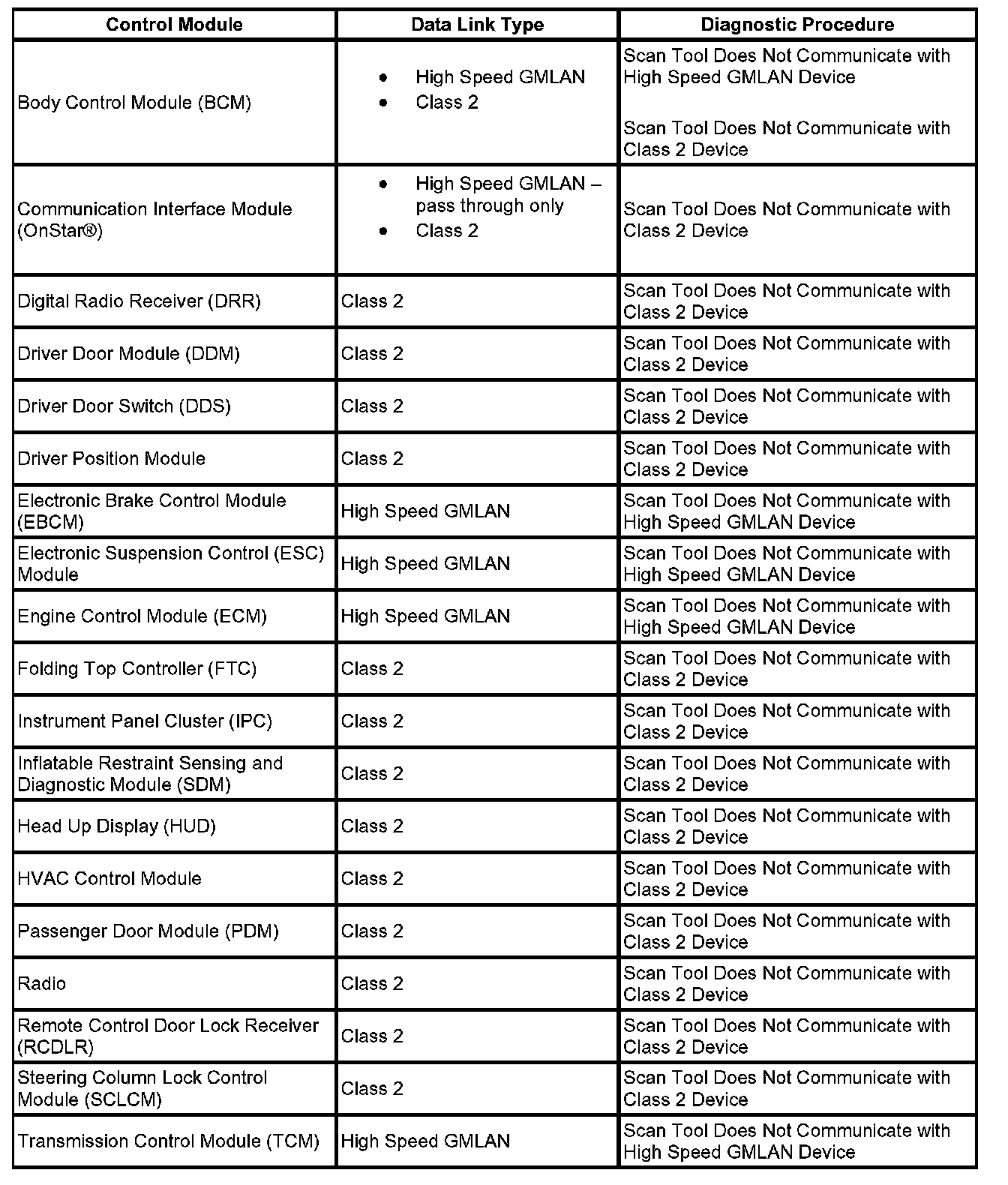 This table identifies which serial data link that a particular module uses for in-vehicle data transmission. Some modules may use more than one data link to communicate. Some modules may have multiple communication circuits passing through them without actively communicating on that data link. This table is used to assist in correcting a communication malfunction. The BCM emulates some devices that are on high speed GMLAN serial data circuit to the modules on class 2 serial data circuit. The BCM transmits multiple Node Alive messages using source IDs that correspond to each of those high speed GMLAN nodes. This is in addition to the BCM behaving itself as a real node. For the description and operation of these serial data communication circuits refer to Data Link Communications Description and Operation