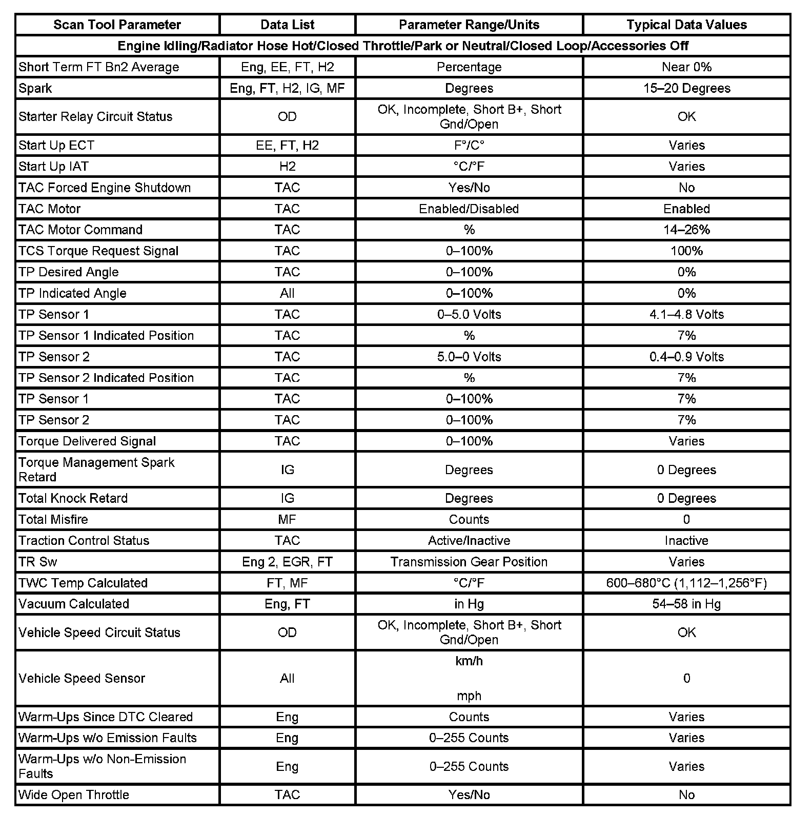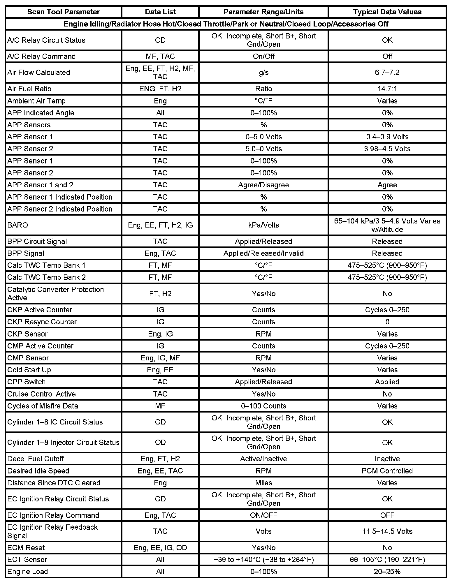 The Engine Scan Tool Data List contains all engine related parameters that are available on the scan tool. The list is arranged in alphabetical order. A given parameter may appear in any one of the data lists, and in some cases may appear more than once, or in more than one data list in order to group certain related parameters together.