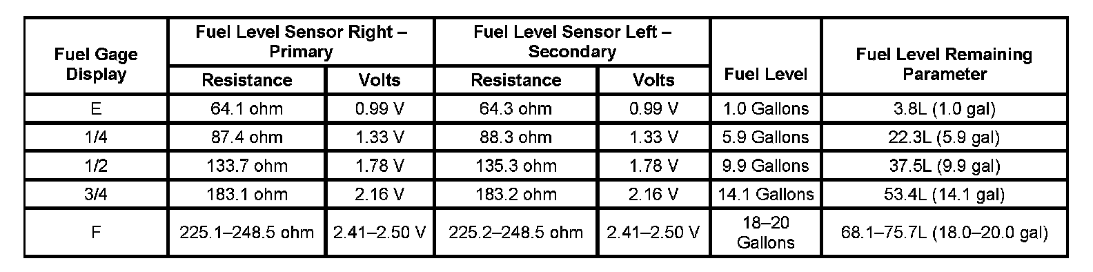 The information in this table is intended for use with the J 33431-C Signal Generator and Instrument Panel Tester. The fuel level sensor values represent the test values to be used on the Signal Generator to drive the fuel gage display to the indicated positions. Vehicles that require more than one fuel level sensor calculate gage position from many possible resistance combinations of fuel levels between the two tanks. Therefore, the values in the table may not correlate directly to readings taken from the vehicle primary or secondary sending units.