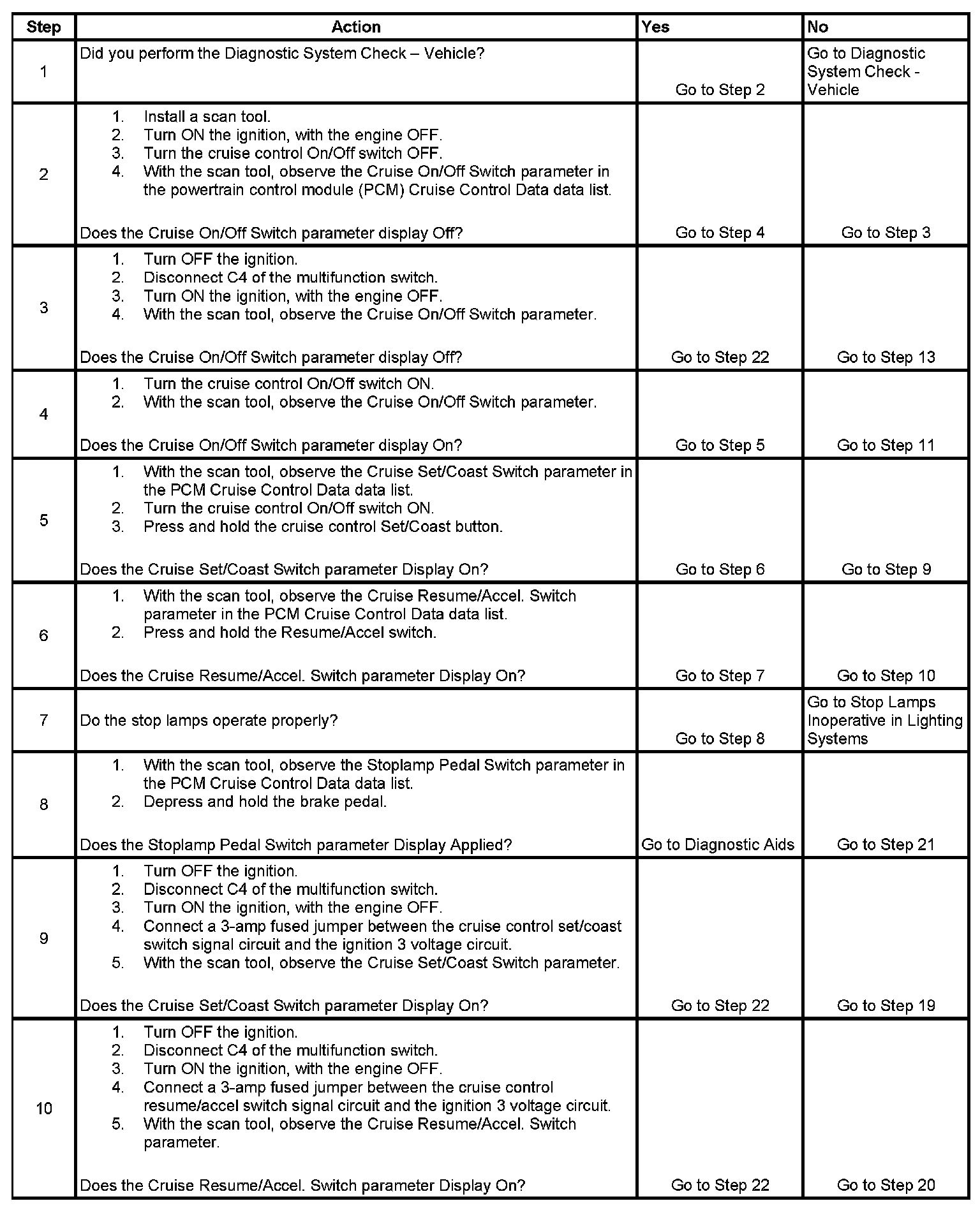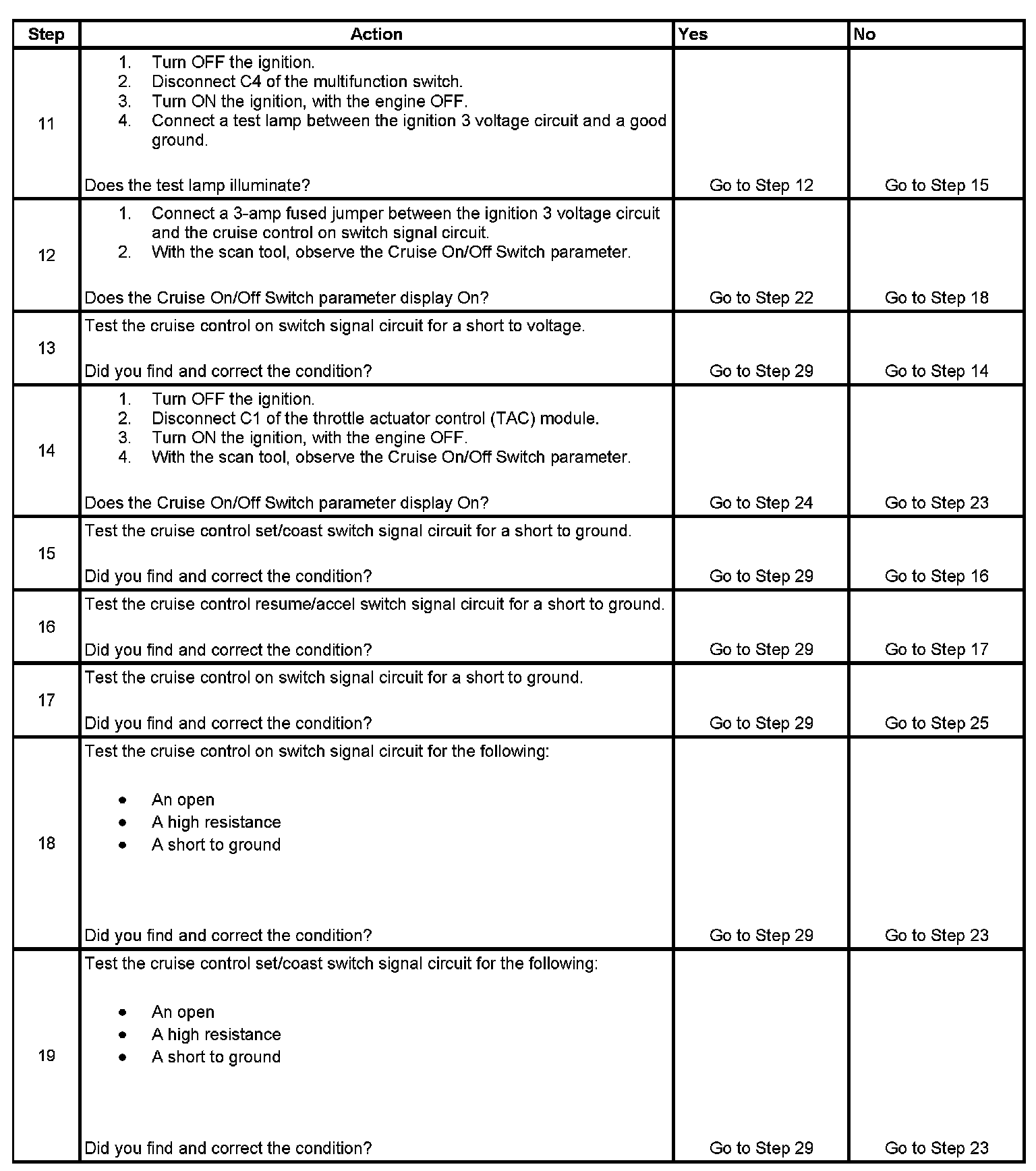 10. This step tests the cruise control resume/accel switch signal circuit for an open or for a high resistance.