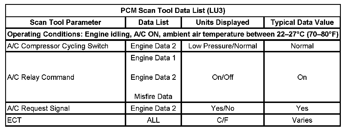Use the Scan Tool Data Display Values and Definitions Information in order to assist in diagnosing the Powertrain Control Module (PCM) problems. Compare the vehicles actual scan tool data with the typical data display value table information. Use the data information in order to aid in understanding the nature of the problem when the vehicle does not match with the typical data display values.