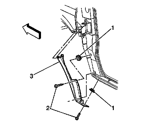 2. Remove the bolt (2) retaining the front fender extension (3) to the rocker panel.