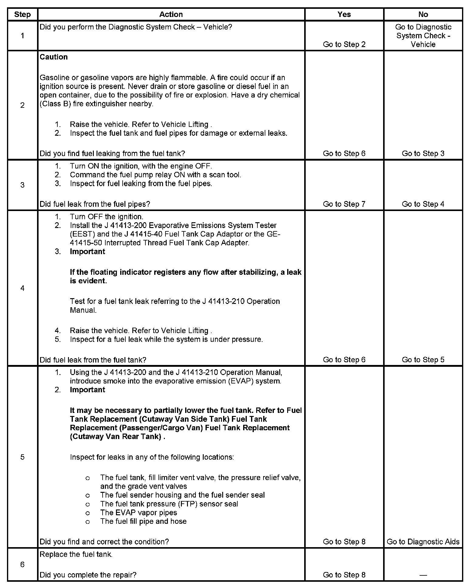 The fuel tank leak test is used to locate any fuel or fuel vapor escaping the fuel tank area. Fuel vapors escaping above the fuel level will be detected when the evaporative emission (EVAP) diagnostics complete one test cycle. The malfunction indicator lamp (MIL) will illuminate after the EVAP diagnostics have failed two test cycles.
