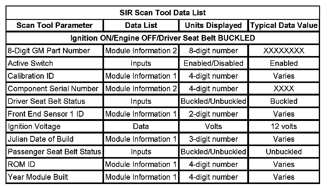 The SIR Scan Tool Data List contains all the restraint system related parameters that are available on the scan tool. The parameters in the list are arranged in alphabetical order. The column, "Data List," indicates the location of the parameter within the scan tool menu selections.