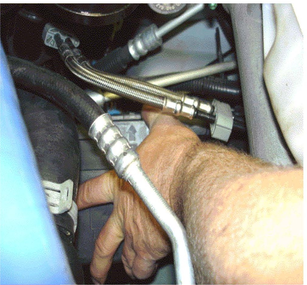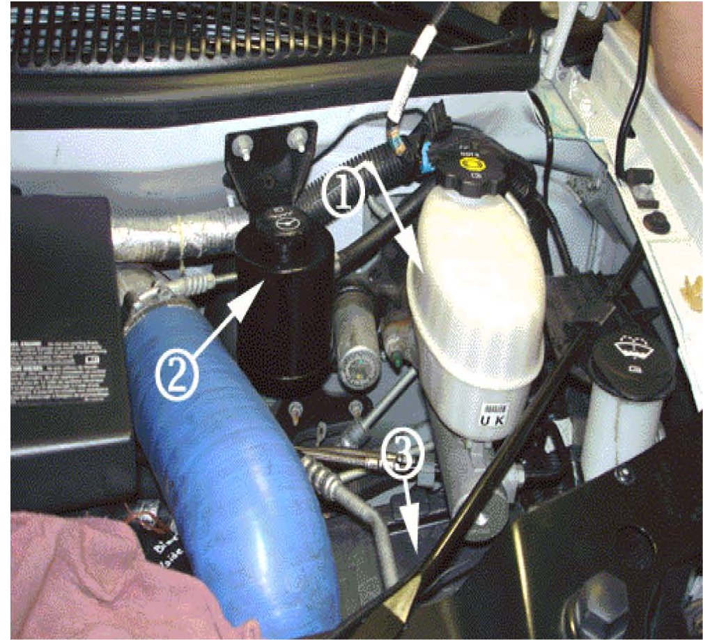 1. Open the hood and locate the brake fluid reservoir (1) and power steering reservoir (2), which reside on the driver's side of the engine compartment.