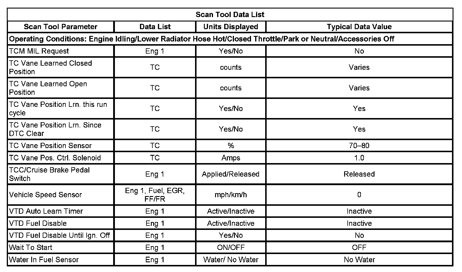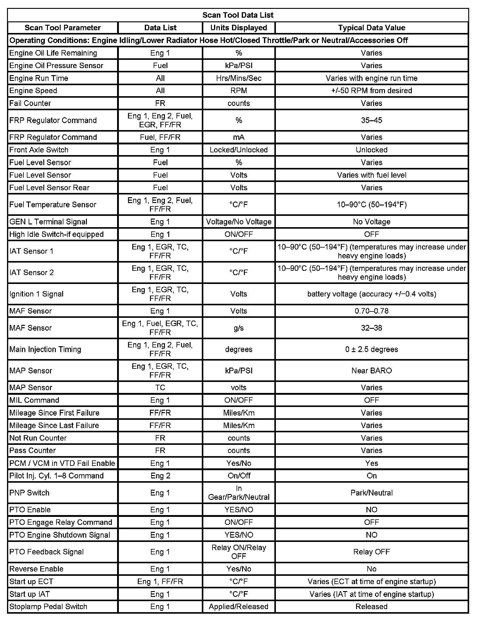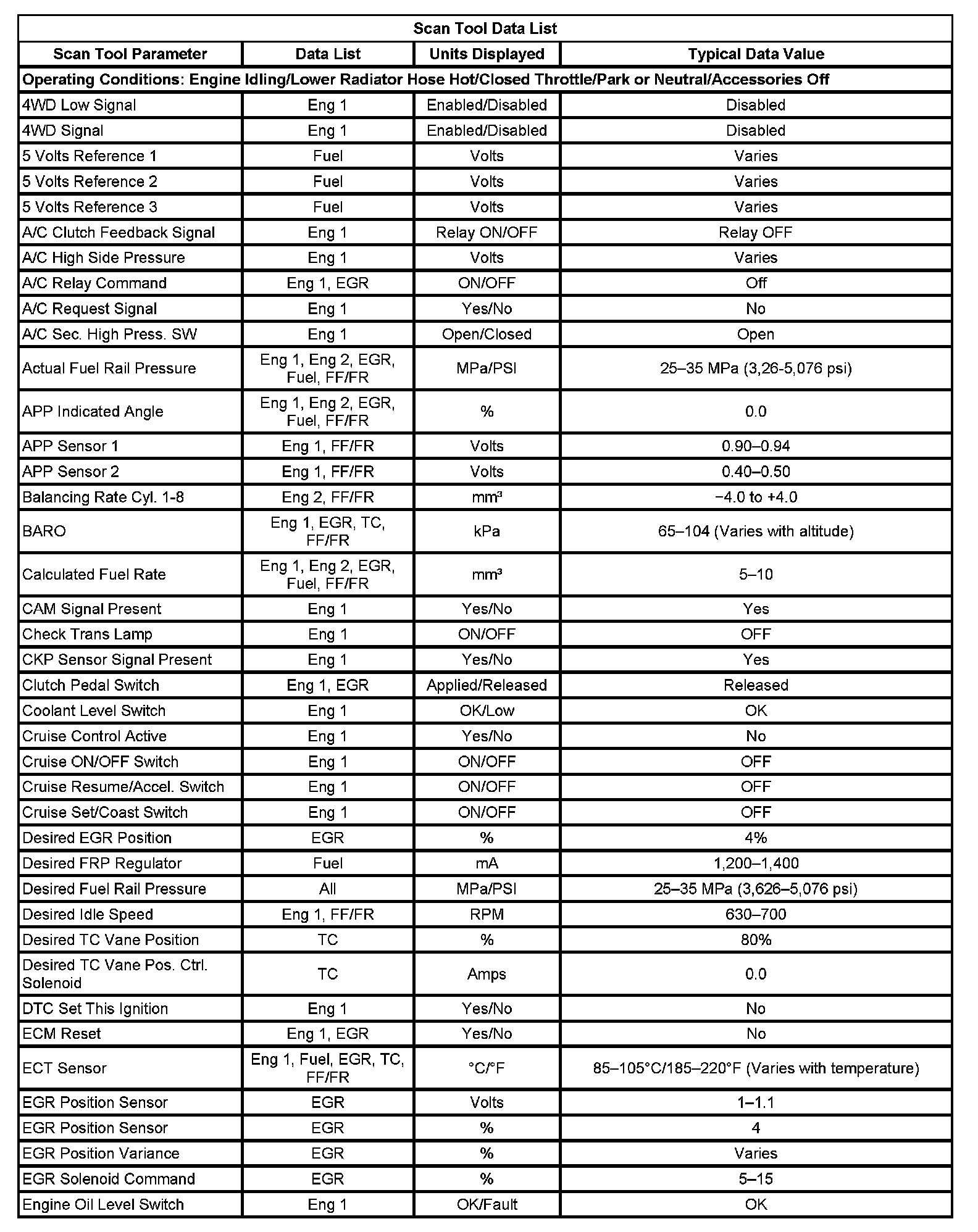Scan tool values from a properly running engine may be used for comparison with the engine you are diagnosing. The Engine Control Module Scan Tool Data List represents values that would be seen on a normal running engine.