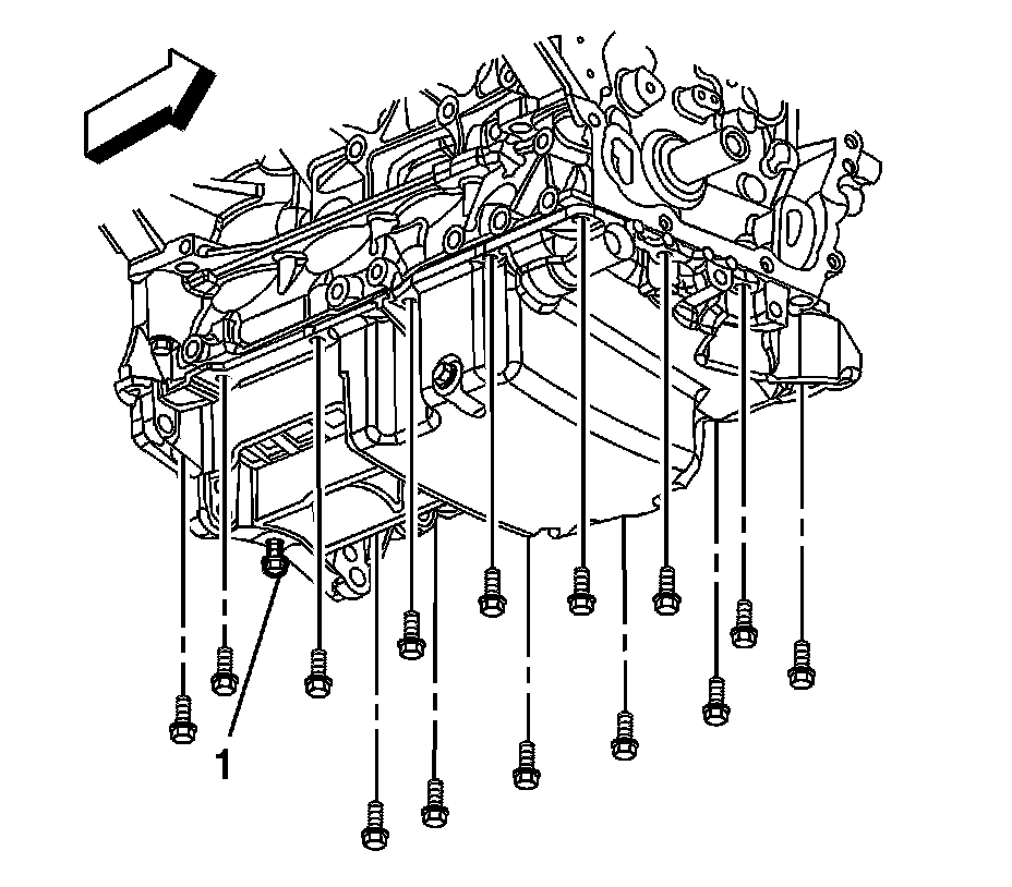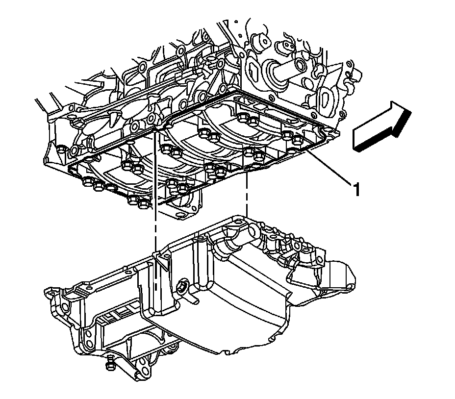 2. Apply a 2 mm bead of sealant (1) GM PN 12346286 (Canadian PN 10953472) or equivalent, around the perimeter of the oil pan and the oil suction port opening. DO NOT over apply the sealant. More than a 2 mm bead is not required.