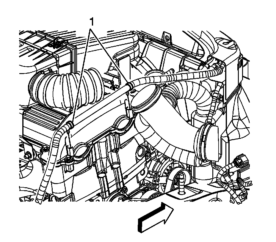 92. Install the engine coolant heater cord clips (1) to the camshaft cover, if equipped with a manual transaxle, if necessary.