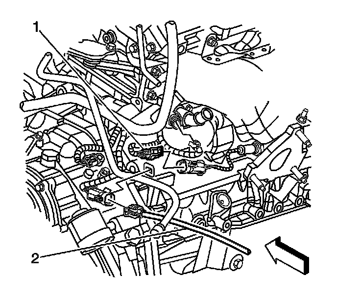3. Install the HO2S electrical harness lead (2) into the trough (1) on the exhaust heat shield, and bend the trough up slightly.