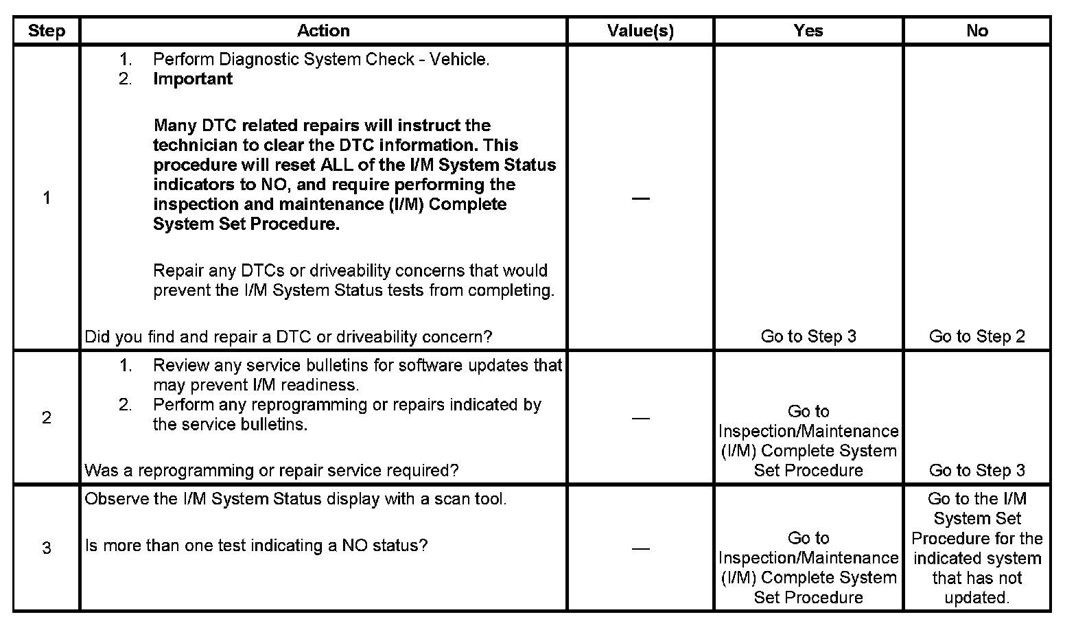 For the specific DTCs required for each system, refer to Inspection/Maintenance (I/M) System DTC Table. Systems such as fuel delivery, misfire, and comprehensive components may not be listed in a system status list. These tests run continuously and do not require an I/M System Status indicator. System DTC Table