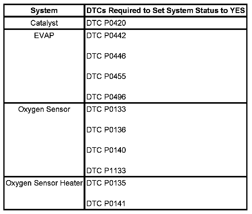 Inspection/Maintenance (I/M) System DTC Table: