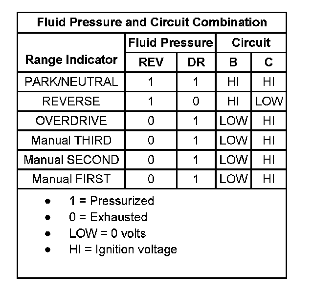 The transmission range (TR) switch is part of the park/neutral position (PNP) and back-up lamp switch assembly, which is externally mounted on the transmission manual shaft. The TR switch contains four internal switches that indicate the transmission gear range selector lever position. The powertrain control module (PCM) supplies ignition voltage to each switch circuit. By grounding one or more of the switch circuits, the PCM detects the selected gear range by the state change of the switch input. Refer to Transmission Range Switch Logic. Switch input to the PCM is represented on the scan tool as HI and LOW. HI indicates an ignition voltage signal. LOW indicates a zero voltage signal. The four parameters represent transmission range switch signal A, B, C and Parity.