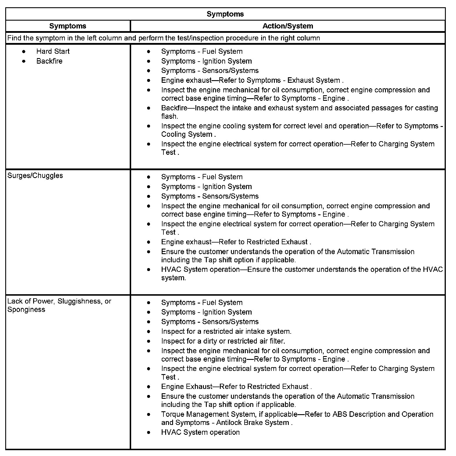 - Locate the correct symptom. Perform the tests and inspections associated with the symptom.