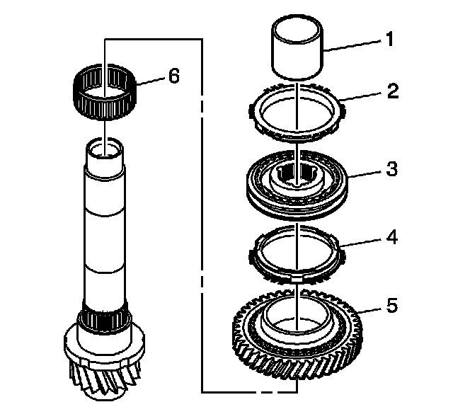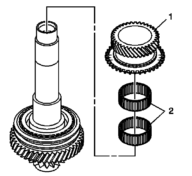 3. Remove the 5th gear (1) and the two caged needle bearings (2).