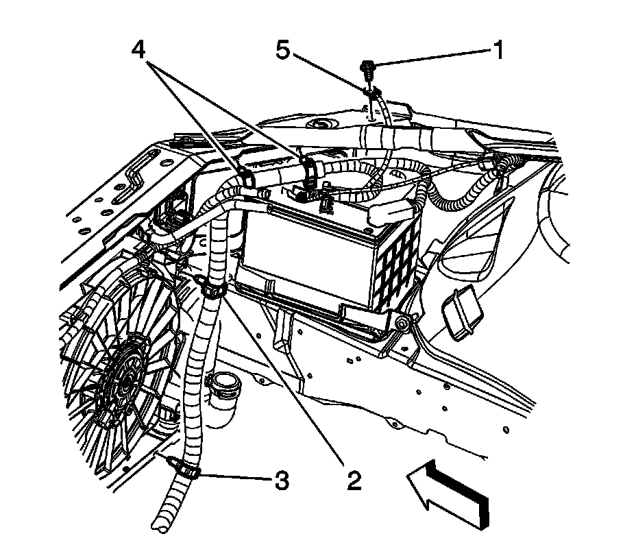 11. Remove the battery cable harness retaining clips (2, 3, and 4) from the front rail and fan shroud.