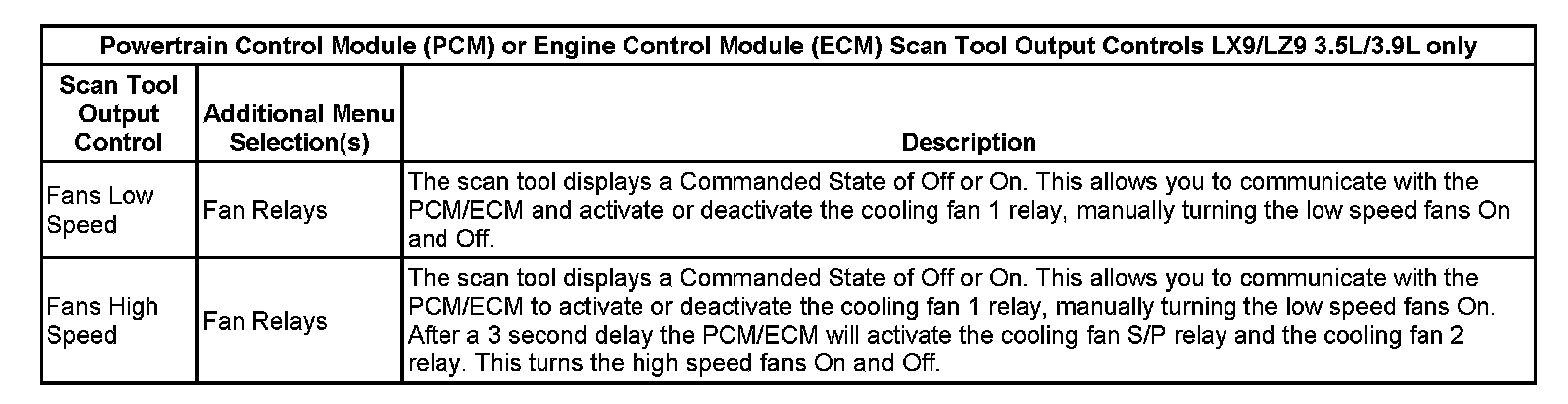 Powertrain Control (PCM) Or Engine Control Module (ECM) Scan Tool Output Controls LX9/LZ9 3.5L/3.9L Only: