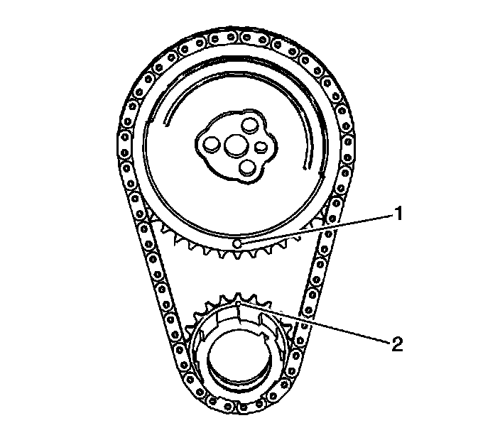 Inspect for proper alignment of the camshaft and crankshaft sprocket timing marks (1, 2).