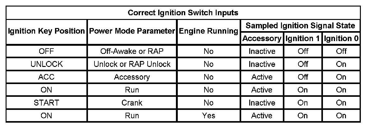 Those modules that have discrete ignition signal inputs also remain in the state dictated by the last valid BCM message received on the serial data circuits. They then check the state of their discrete ignition input to determine the current valid state. If the discrete ignition input is active, B+, the modules will fail-safe to the RUN power mode. If the discrete ignition input is not active, open or 0 voltage, the modules will fail-safe to OFF-AWAKE. In this state the modules are constantly checking for a change status message on the serial data circuits and can respond to both local inputs and serial data inputs from other modules on the vehicle.