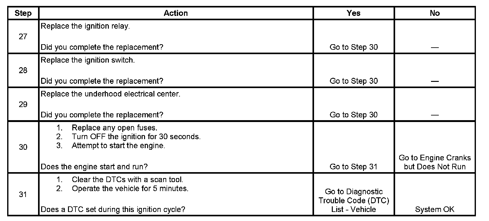 If the ignition relay fails to close, the engine will crank, but will not run. The class 2 communications will be available with the use of a scan tool.