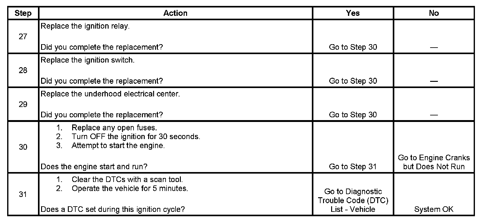 If the ignition relay fails to close, the engine will crank, but will not run. The class 2 communications will be available with the use of a scan tool.