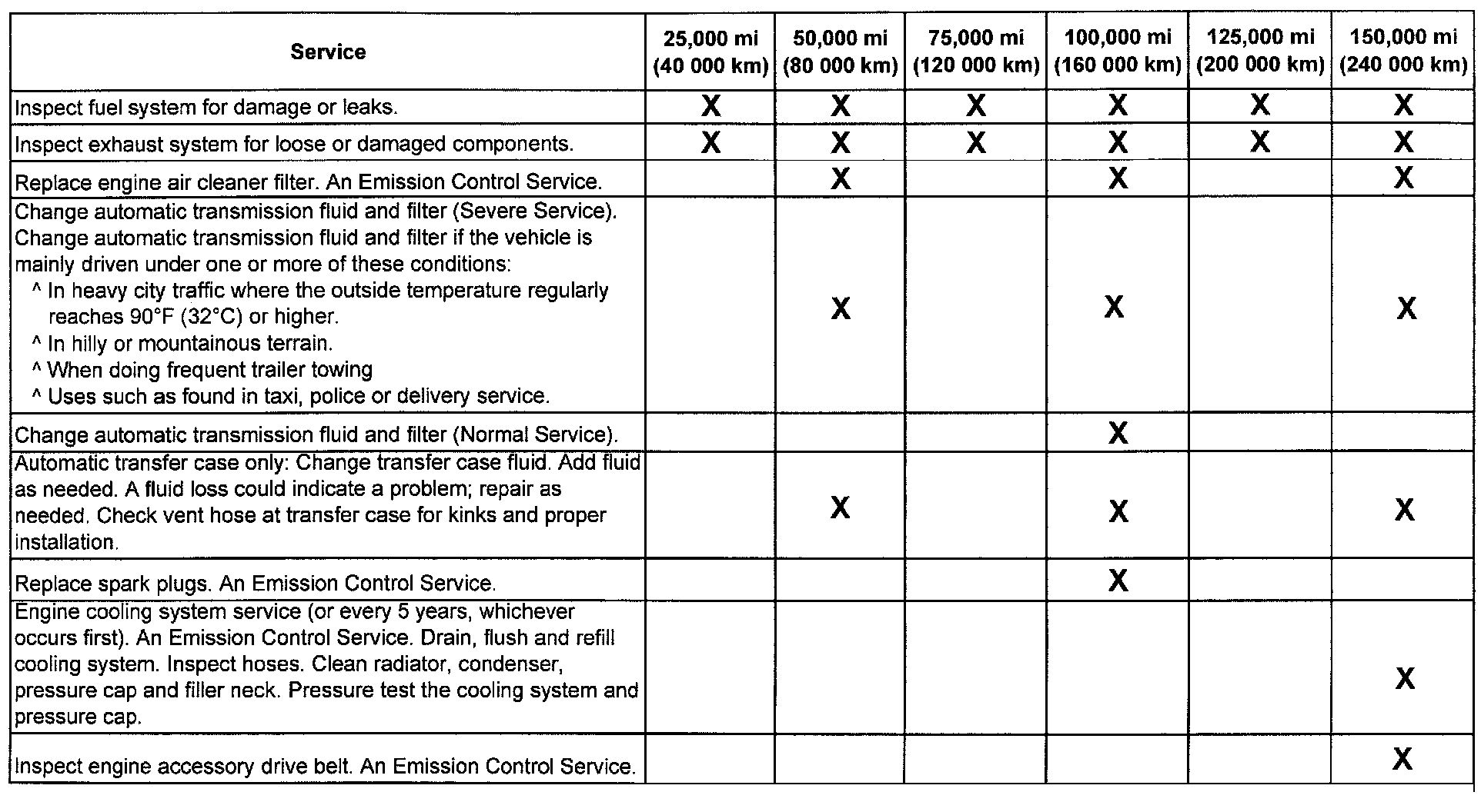 (Maintenance I or Maintenance II) after the indicated kilometers (miles) shown for each item.