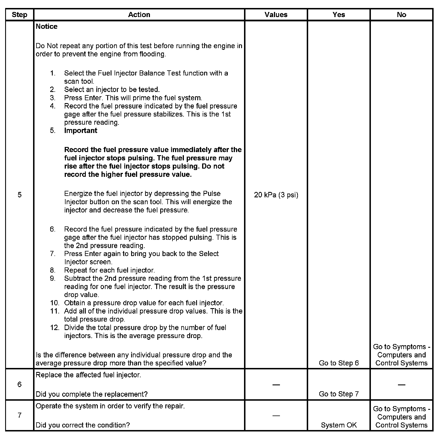 The scan tool is first used to energize the fuel pump. The scan tool is then used to pulse each injector for a precise amount of time, allowing a measured amount of fuel into the manifold. This causes a drop in system fuel pressure that can be recorded and used to compare the flow through each injector.