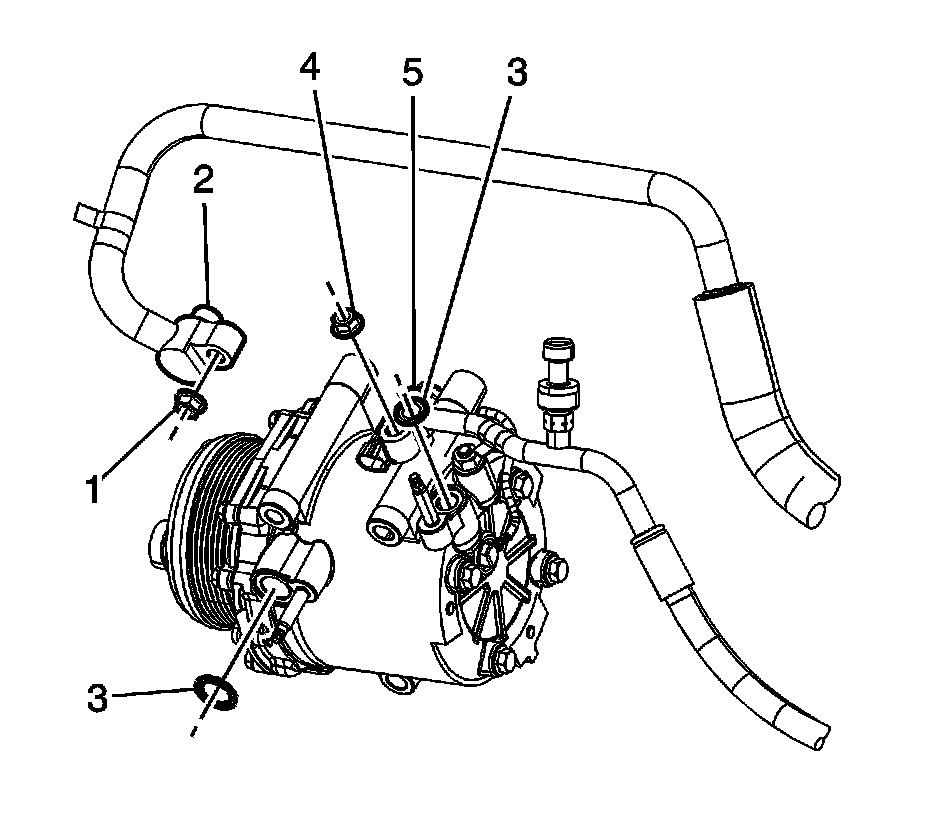 7. If equipped with a C69 compressor, remove the discharge line (5) to compressor nut (4).