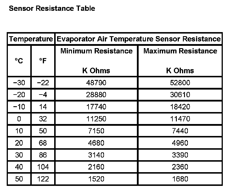 Sensor Resistance Table: