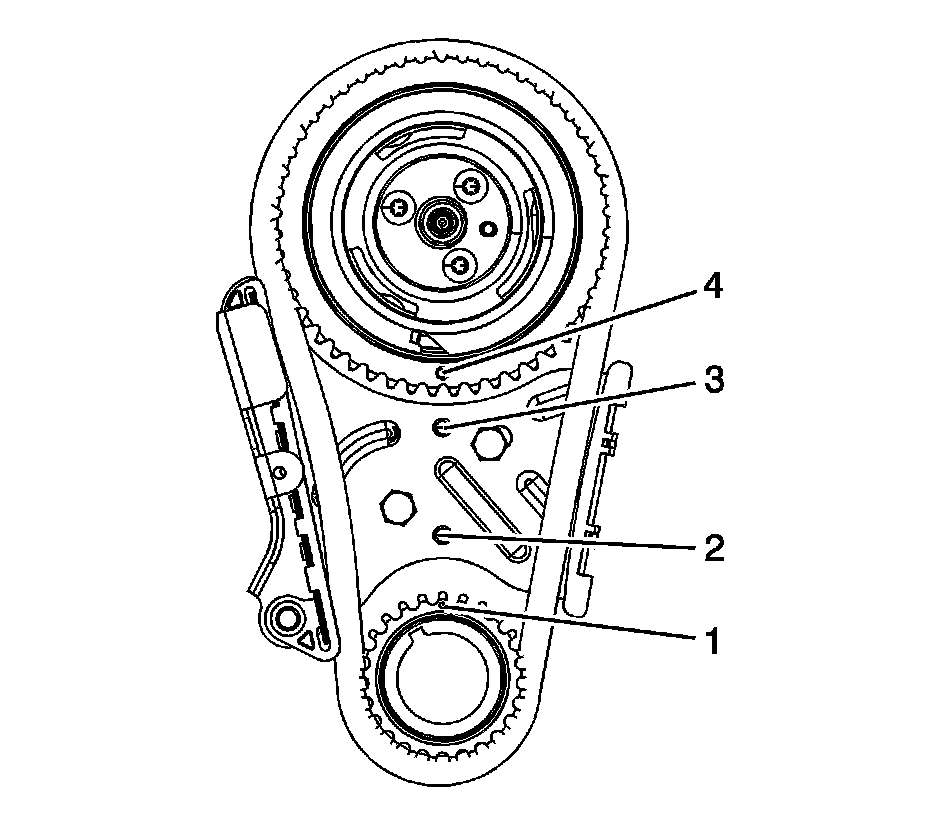 Align the timing mark on the camshaft gear (3) with the timing mark on top of the timing chain tensioner (4).