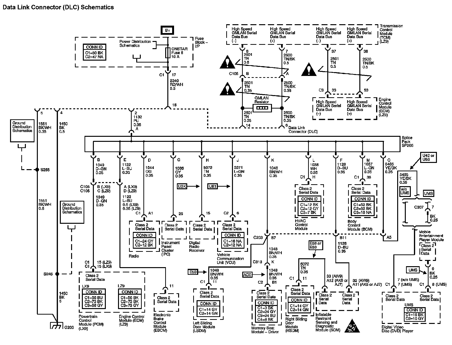 The locations for the Connectors, Grounds, Splices, and Grommets shown within these diagrams can be found via their numbers at Vehicle Locations.