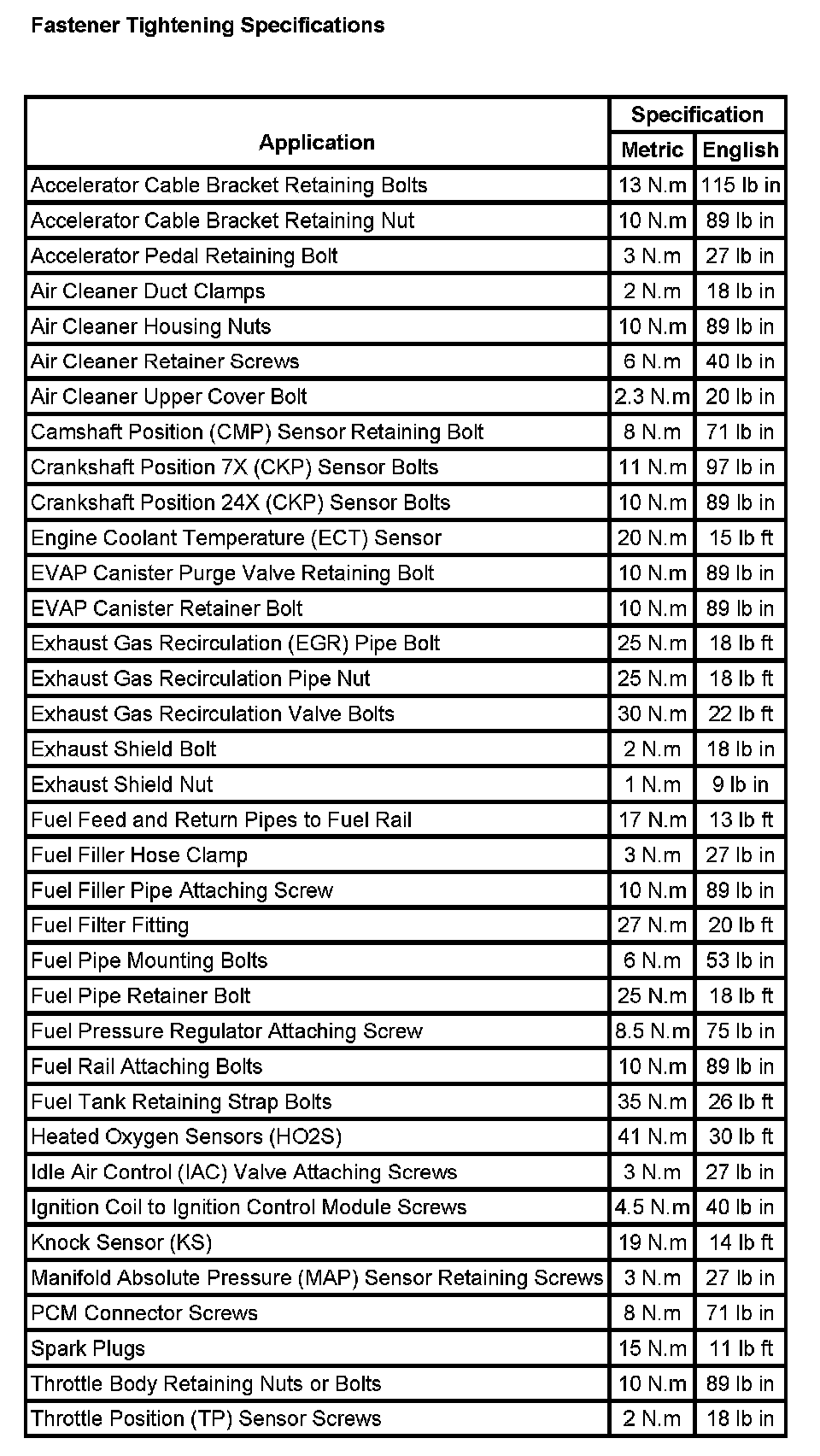 Fastener Tightening Specifications: